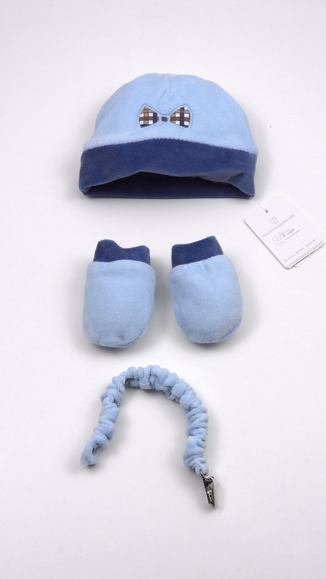 Set neonato nascita Nazareno Gabrielli, tre pezzi, cuffia, guanti anti graffio, porta ciuccio con elastico, realizzate in Ciniglia di Cotone